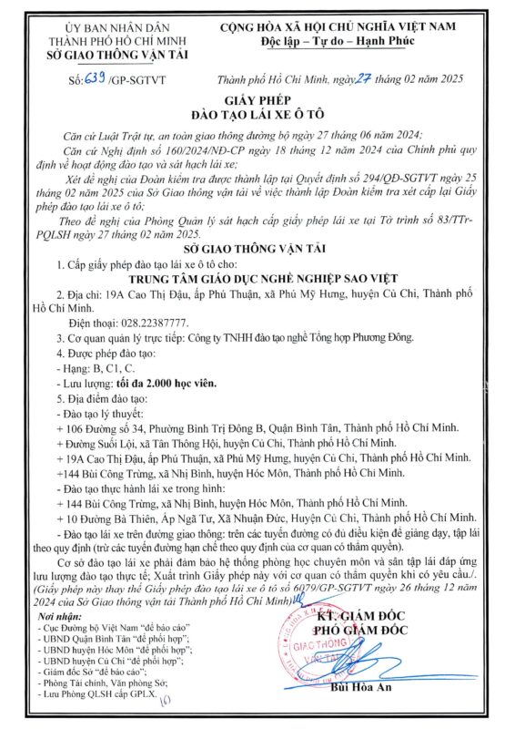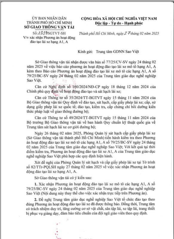 Trung tâm Giáo dục nghề nghiệp Sao Việt được Sở Giao thông vận tải Thành phố Hồ Chí Minh xác nhận Phương án hoạt động đào tạo lái xe hạng A1, A theo văn bản số 2319/SGTVT-SH ngày 27 tháng 02 năm 2025
